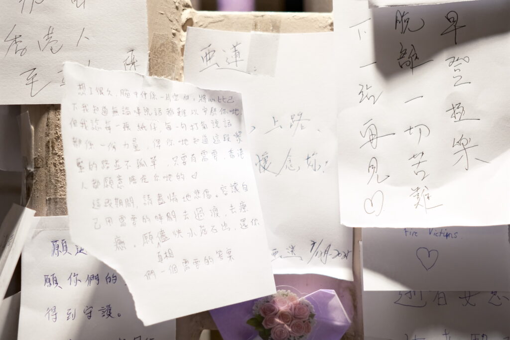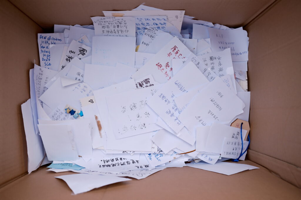 義工打算按 Memo 的內容分門別類,交給悼詞致意的對象。或火化給死者,或轉交予難屬、消防員、動保組織等。「之前有啲真實案例,家屬係靠市民寫嘅紙仔度過難關。」