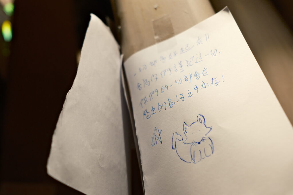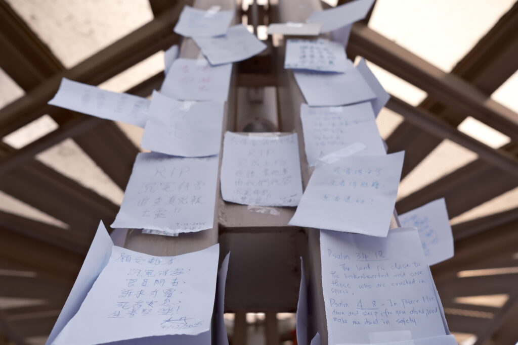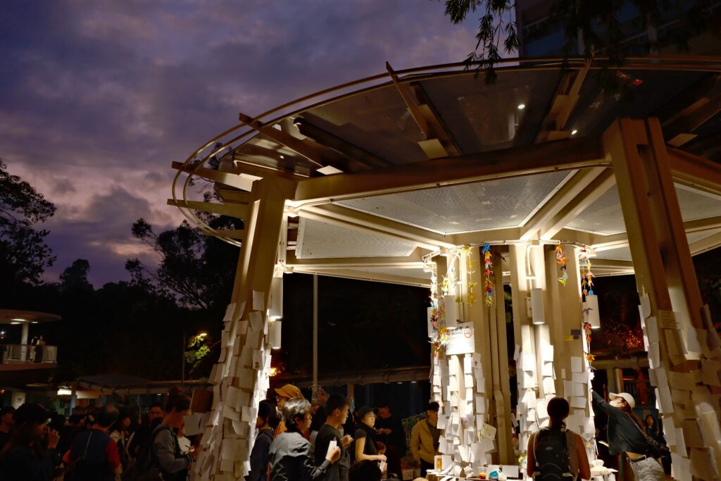 在涼亭的最後一晚,貼 Memo 的人明顯較少,更多人加入摺紙鶴的行列。一位義工說:「好多時候好多心情唔可以透過紙筆寫出嚟,冇話好定唔好。紙鶴有紙鶴嘅好;寫字有寫字嘅好。」